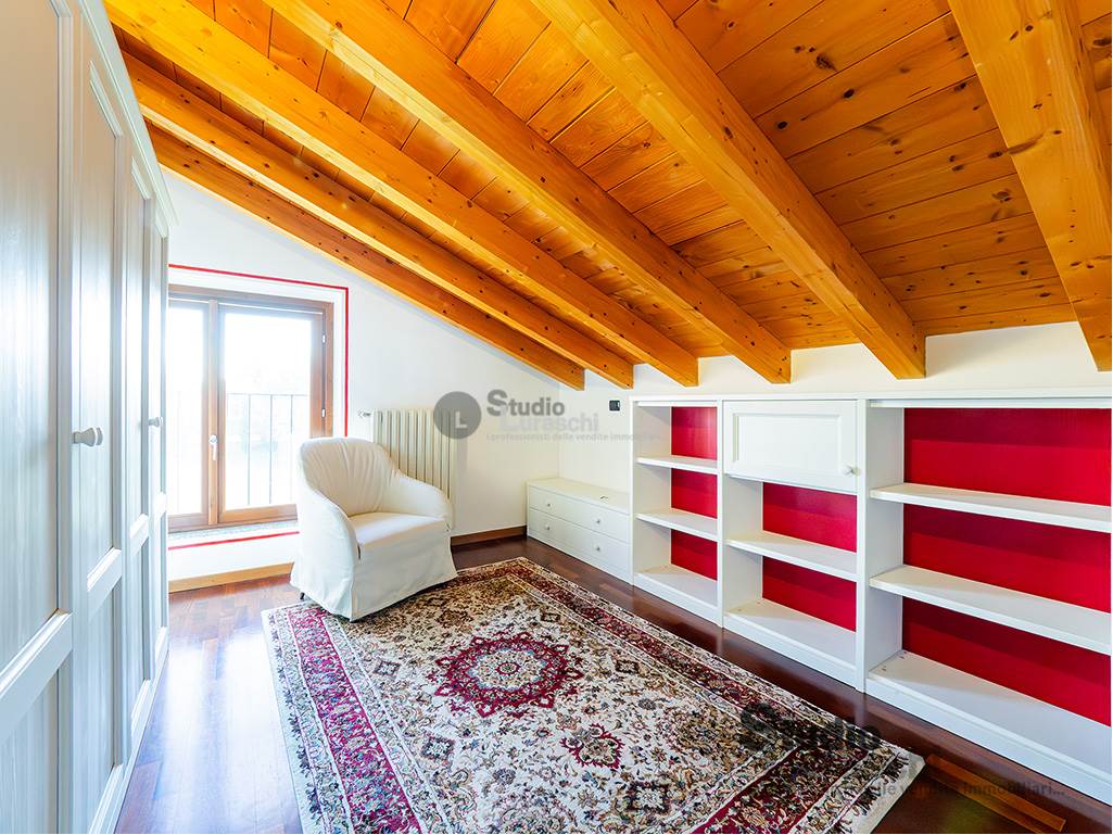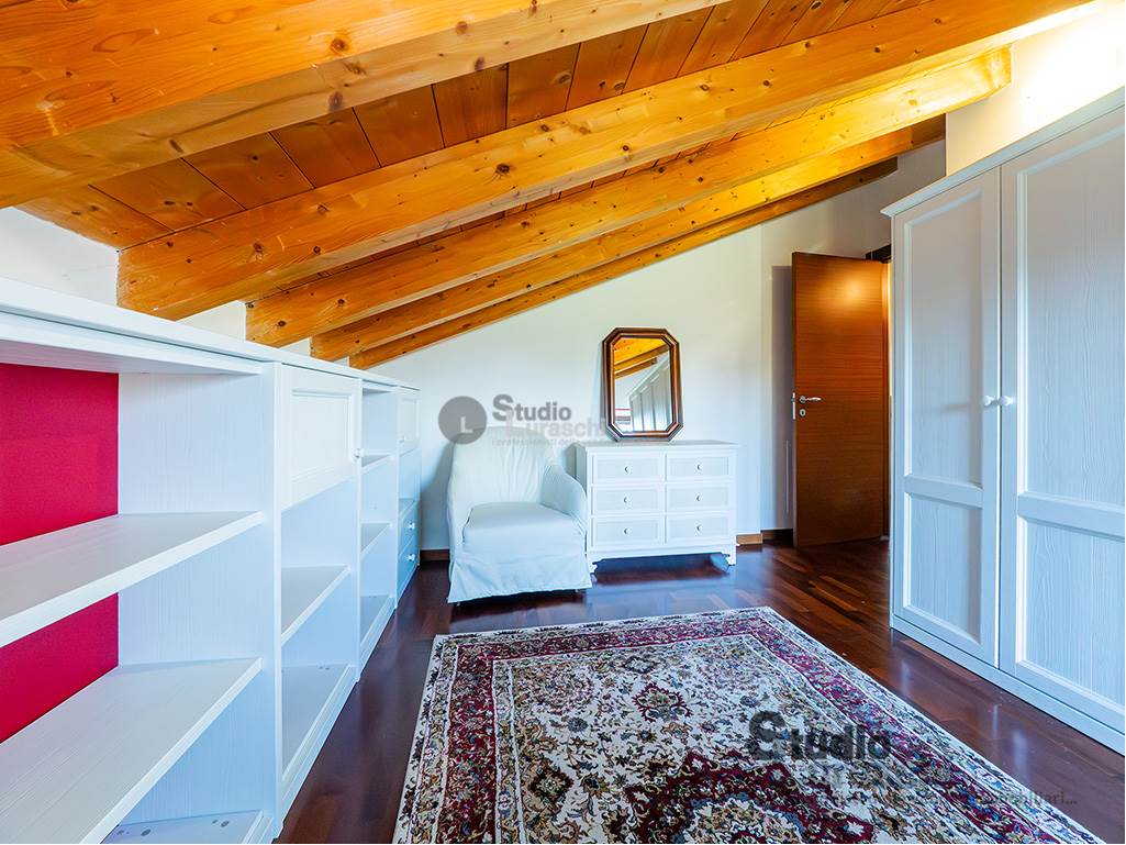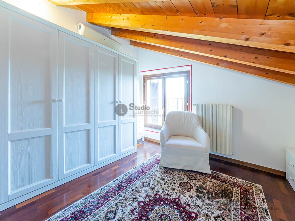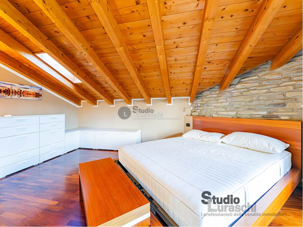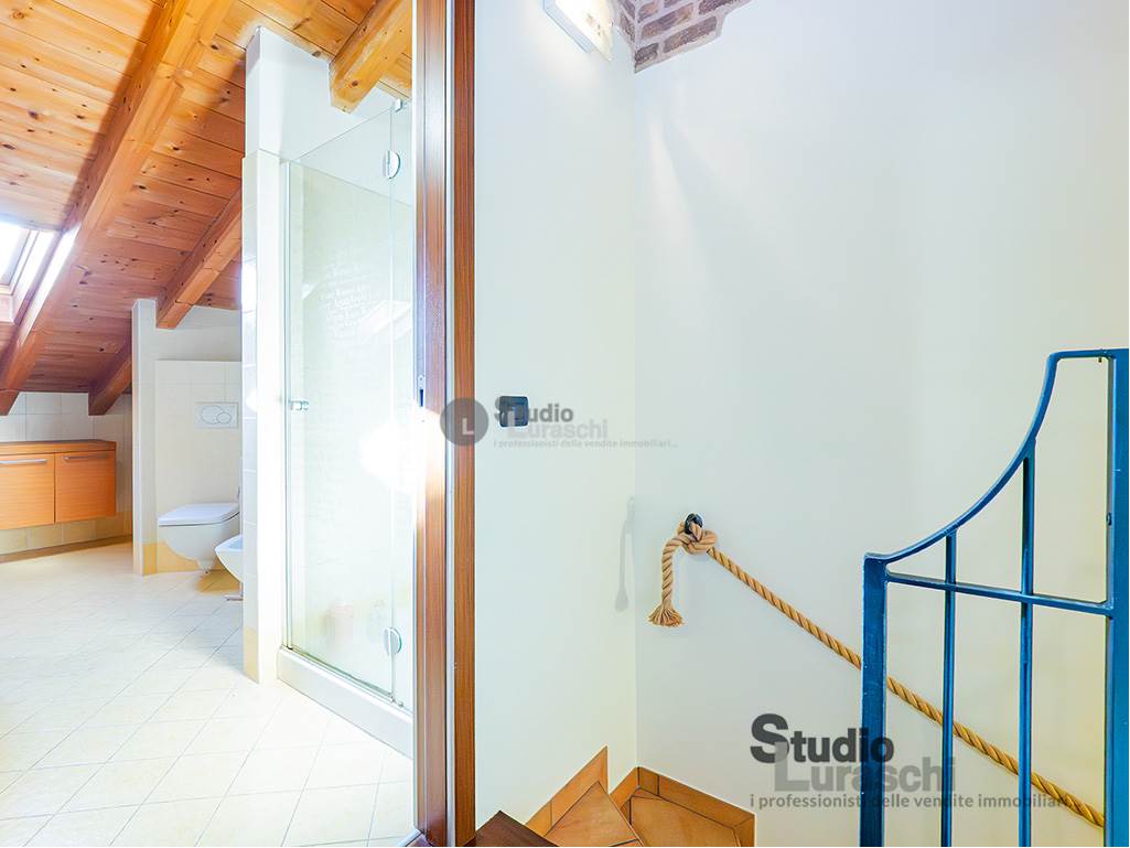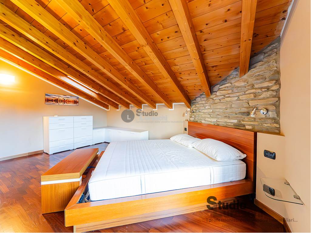 All'interno di un piacevole quartiere residenziale, proponiamo in esclusiva la vendita di un'abitazione sita al piano primo, libera su due lati e ben distribuita. L'appartamento è in buone condizioni, pronto per essere abitato ed è costituito al piano primo da soggiorno con gradevoli dettagli in legno e sasso/mattone, cucina abitabile e bagno finestrato con vasca oltre a piacevole terrazzo che abbraccia su due lati l'unità; al piano secondo mansardato, a cui si accede tramite scala interna a vista, vi sono tre locali accessori attualmente adibiti a zona notte con servizio. Impreziosiscono la proprietà un'autorimessa doppia e una cantina. Impianto di condizionamento presente all'interno dell'abitazione.