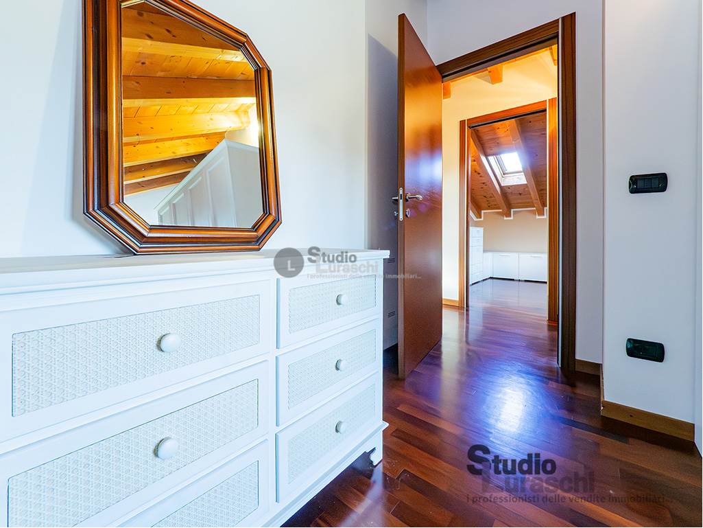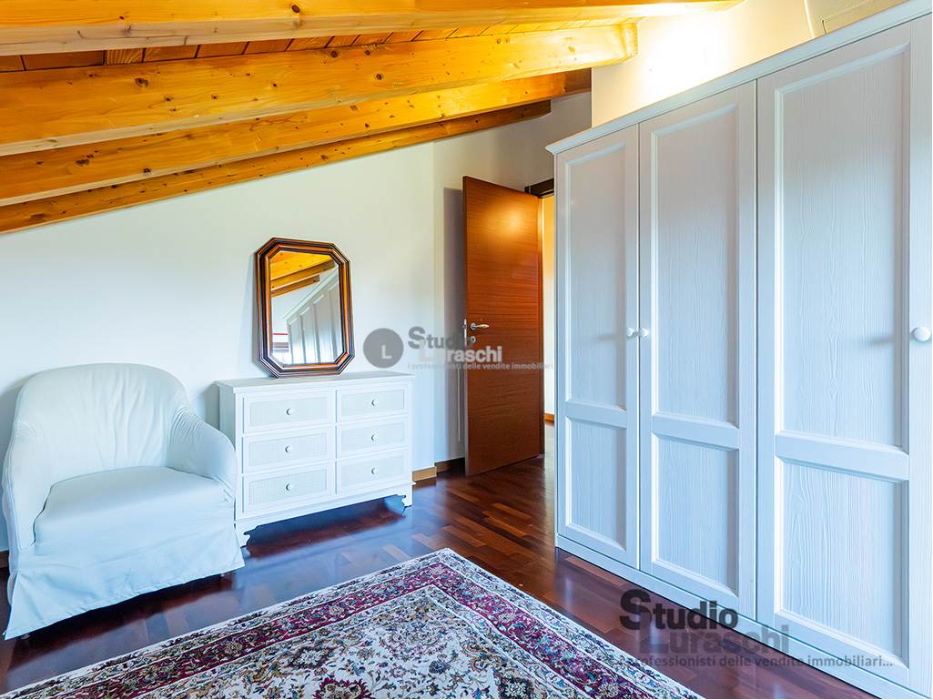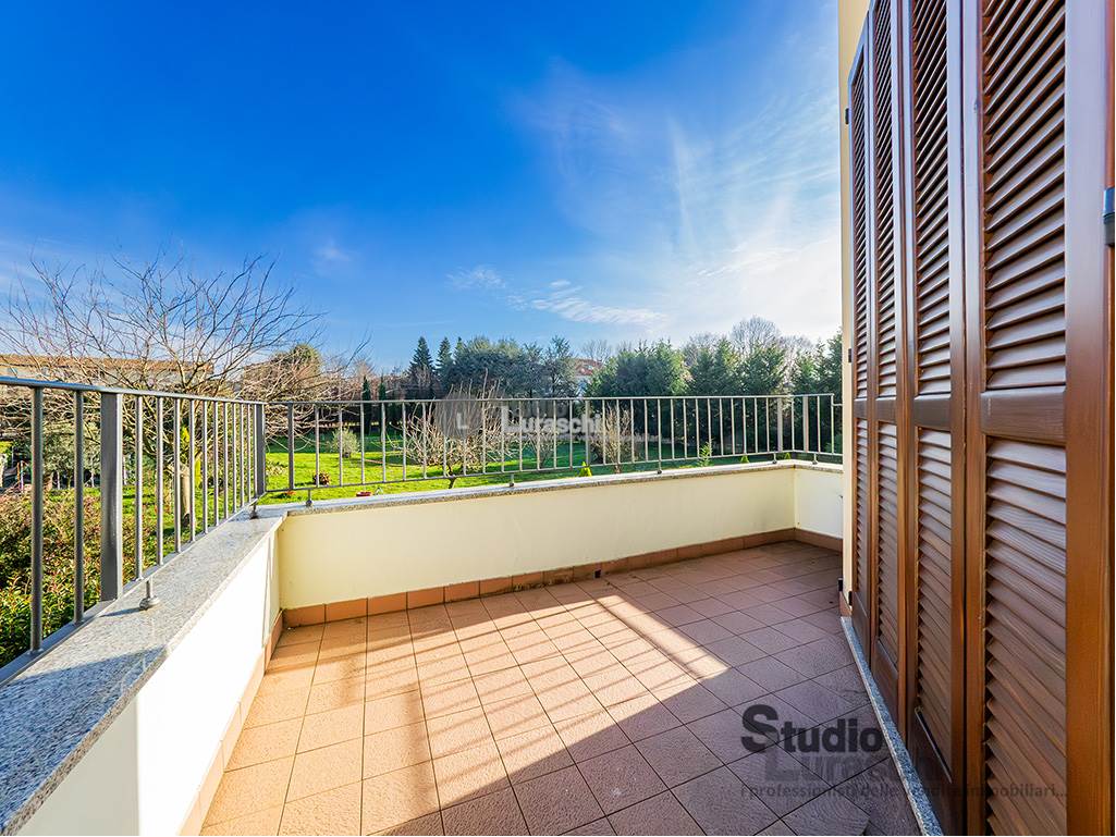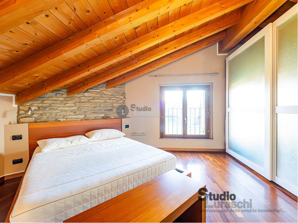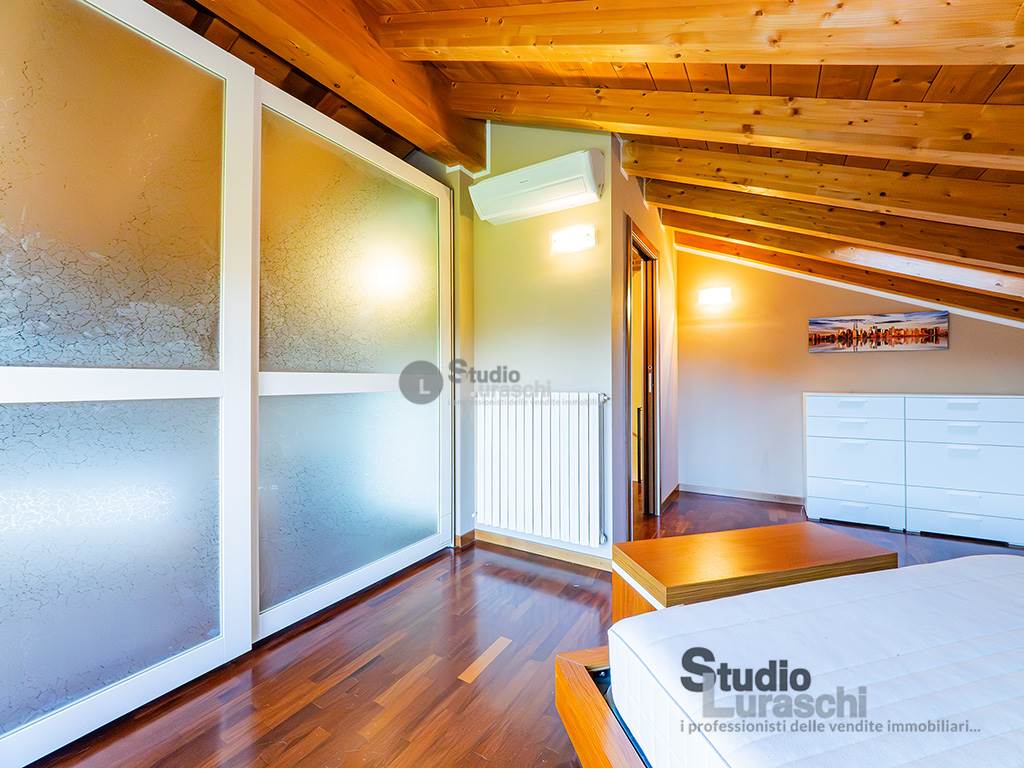 All'interno di un piacevole quartiere residenziale, proponiamo in esclusiva la vendita di un'abitazione sita al piano primo, libera su due lati e ben distribuita. L'appartamento è in buone condizioni, pronto per essere abitato ed è costituito al piano primo da soggiorno con gradevoli dettagli in legno e sasso/mattone, cucina abitabile e bagno finestrato con vasca oltre a piacevole terrazzo che abbraccia su due lati l'unità; al piano secondo mansardato, a cui si accede tramite scala interna a vista, vi sono tre locali accessori attualmente adibiti a zona notte con servizio. Impreziosiscono la proprietà un'autorimessa doppia e una cantina. Impianto di condizionamento presente all'interno dell'abitazione.